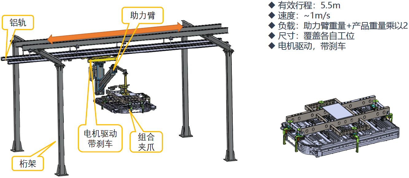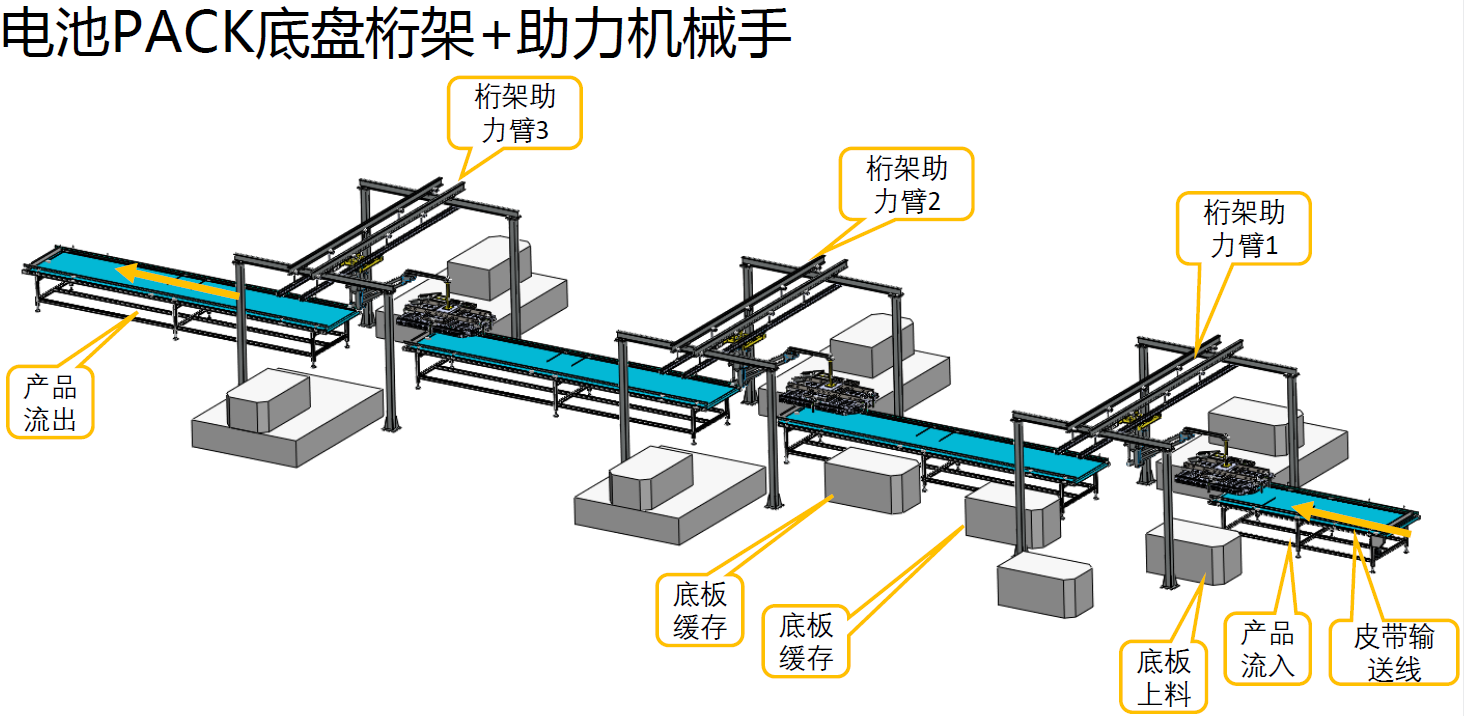 廣州卓鋒設計制作多套新能源電池PACK底盤搬運設備,采用氣動助力機械手+桁架KBK,解決了PACK底盤生產(chǎn)線中上下料問題,是成熟可靠,性價比最高的解決方案。